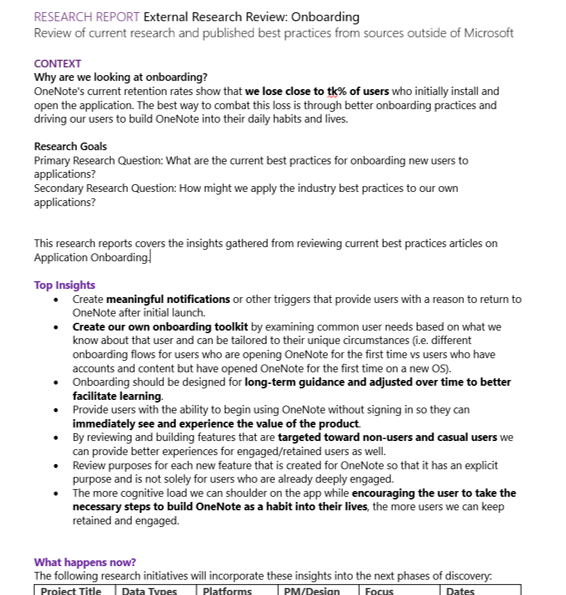 This is an image of the context and key findings from my external research review specific to Onboarding new users to an application.