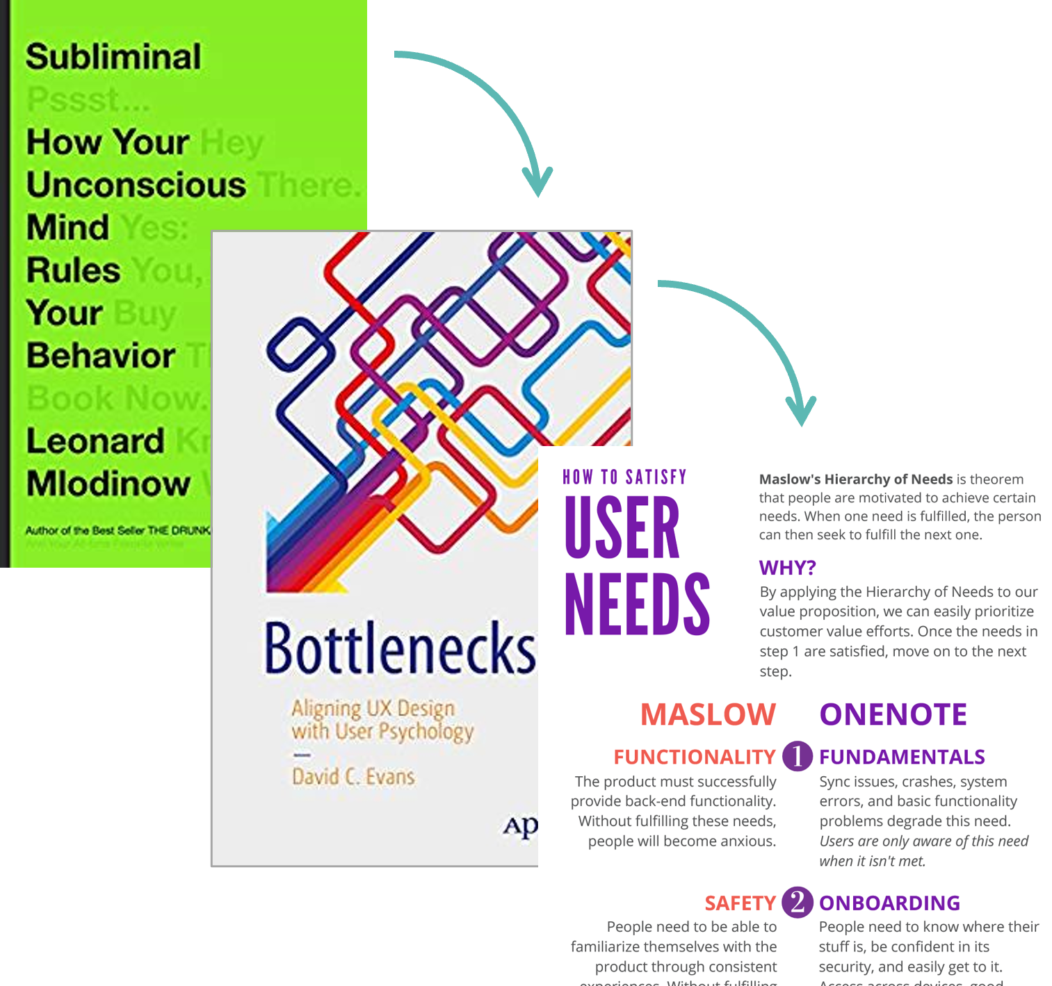 I used insights gained from reading the book Subliminal by Leonard Mlodinow and connected them to user psychology explained in the book Bottlenecks by David C. Evans to generate a list of foundational user needs for Microsoft OneNote.